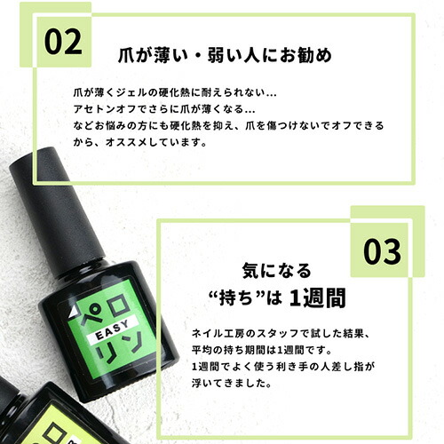 何と言ってもこの「ペロリン」の最大の特徴は、特別なリムーバーを使わずに簡単にオフできる点にあります。忙しい朝や疲れた夜にも、さっとネイルチェンジできるのが魅力です。さらに、自爪を傷めず、健康的な状態を保つことができるのも嬉しいポイント💖 つまり、「ペロリン」は美しいネイルを楽しみながら、爪を守ることもできる、まさに理想のネイルアイテムなんです。簡単にはがせて、再び新しい色に挑戦できるそのサイクルが、忙しい現代女性の強い味方になってくれることでしょう。