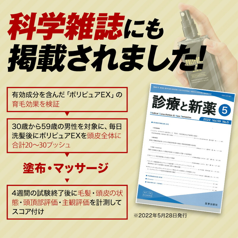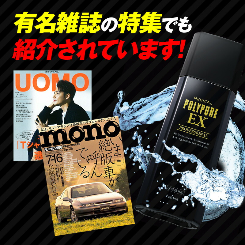 ] ポリピュアEXは、最新の技術を駆使し、髪の毛の成長をサポート。使用するたびに、あなたの髪がどんどん健康的になるのを実感できます。特許を取得した成分が、髪の根本からアプローチし、健やかな髪へと導きます。それは、まるでプロのヘアケアを自宅で受けているかのよう。この製品一つで、あなたの髪は見違えるほどに生き生きとし、輝きを取り戻します。毎日を使い続けることで、だんだんとあなたの髪も変化し、以前あなたが抱えていた髪の悩みが嘘のように感じるはずです。