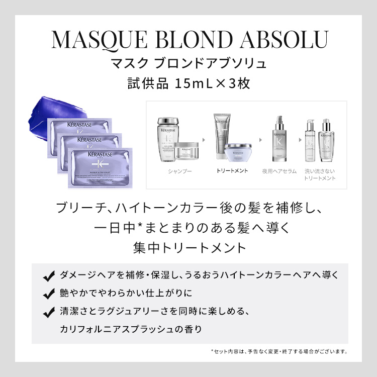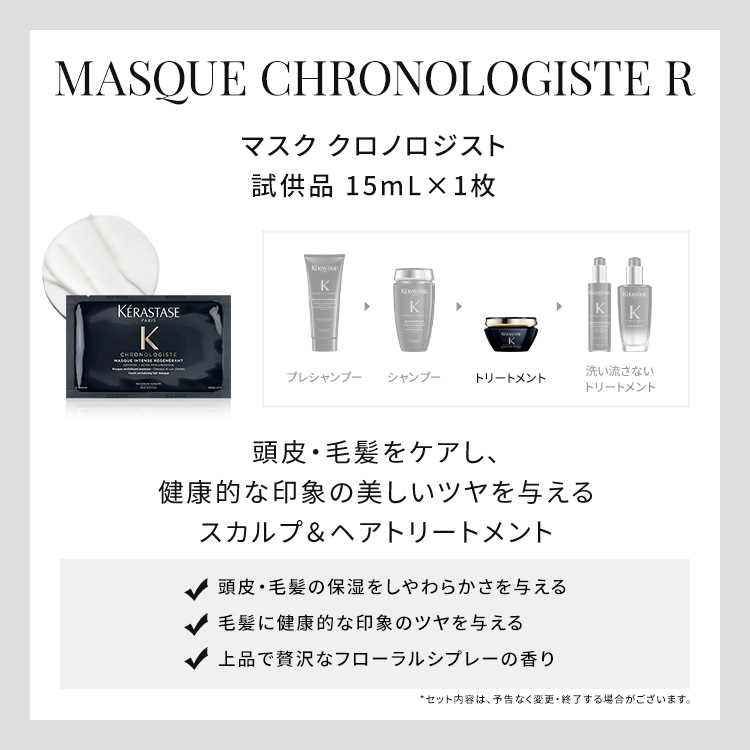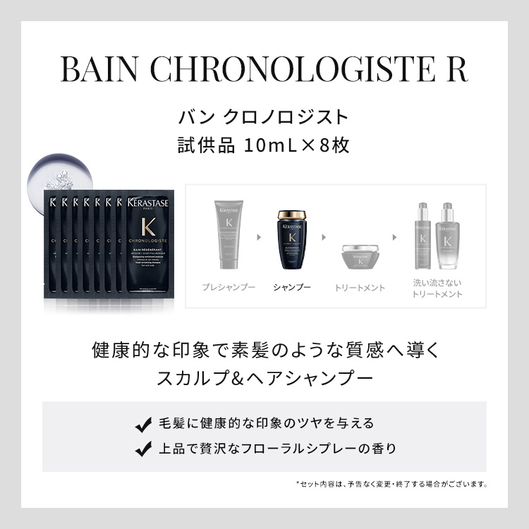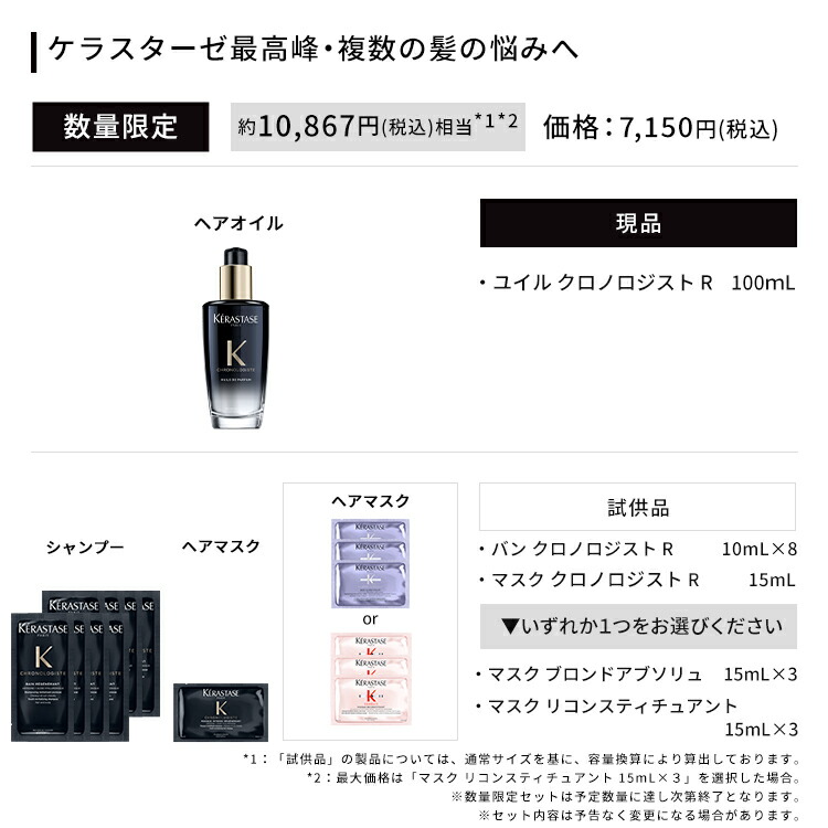 この限定セットには、髪の内部から修復し、美しさを取り戻すためのユイルクロノロジストを含む、豪華試供品がたくさん!🎁 さらに、使用するたびに贅沢な香りに包まれながら、髪が生き生きと輝きを取り戻していくのを実感できますよ。💖 あなたもこのケラスターゼ限定セットで、まるでサロンに通っているかのような豪華なケアを自宅で手軽に体験できるのです。ケアの時間が、もうこれ以上ないくらい特別で、至福のひと時に変わります。この機会に、自分自身への贈り物として、あるいは大切な人へのプレゼントとして、この限定セットを手に入れてみてはいかがでしょうか?