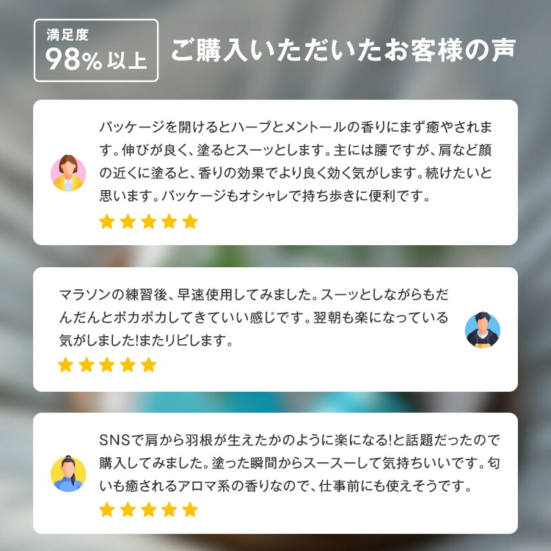 このスポーツバームは、多くの方から高評価を受けています。例えば、30歳女性からは「運動後のリラックスタイムに欠かせないアイテムになりました!」や、28歳女性からは「肩こりがひどい私には神商品です!」など、実際に使用された方々の生の声がたくさん寄せられています。もう、これを見たら試さずにはいられませんよね😆。幅広い年齢層の方に愛されており、どんな生活スタイルの方でもこのスポーツバームの魅力を実感していただけることでしょう。