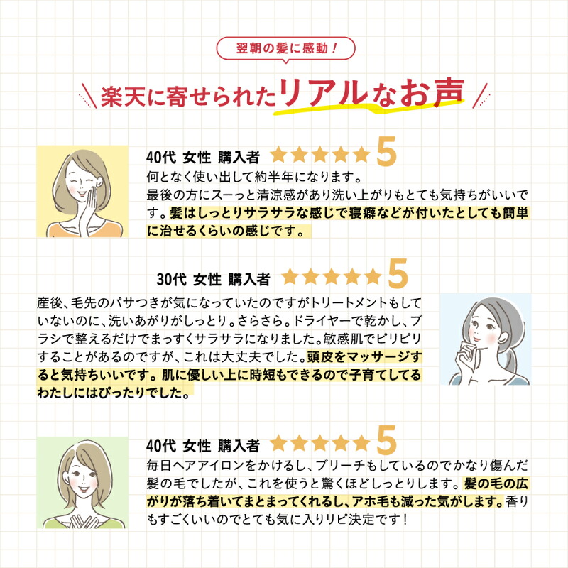 「頭皮の乾燥が気になっていたけど、これを使ってから改善されました(28歳・★★★★★)」